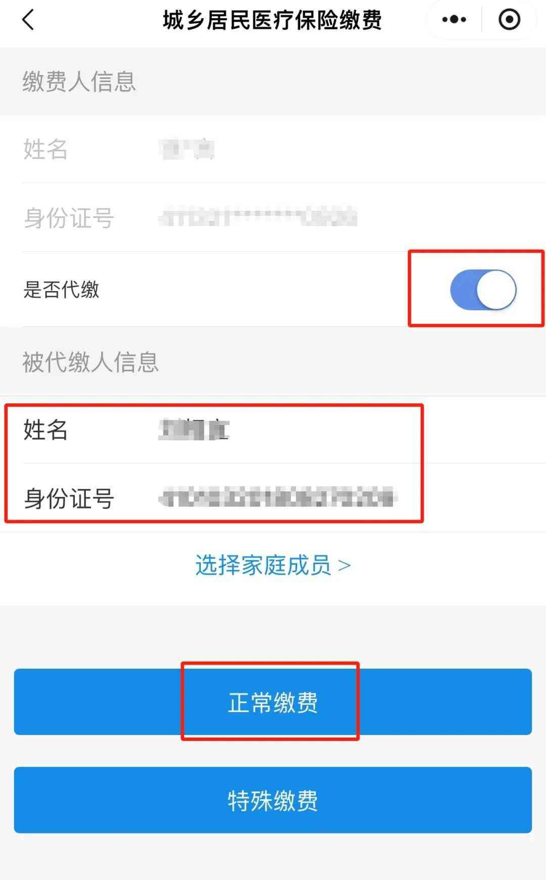 打开【是否代缴】开关,输入被代缴人信息。点击【正常缴费】-【城乡居民基本医疗保险费】。