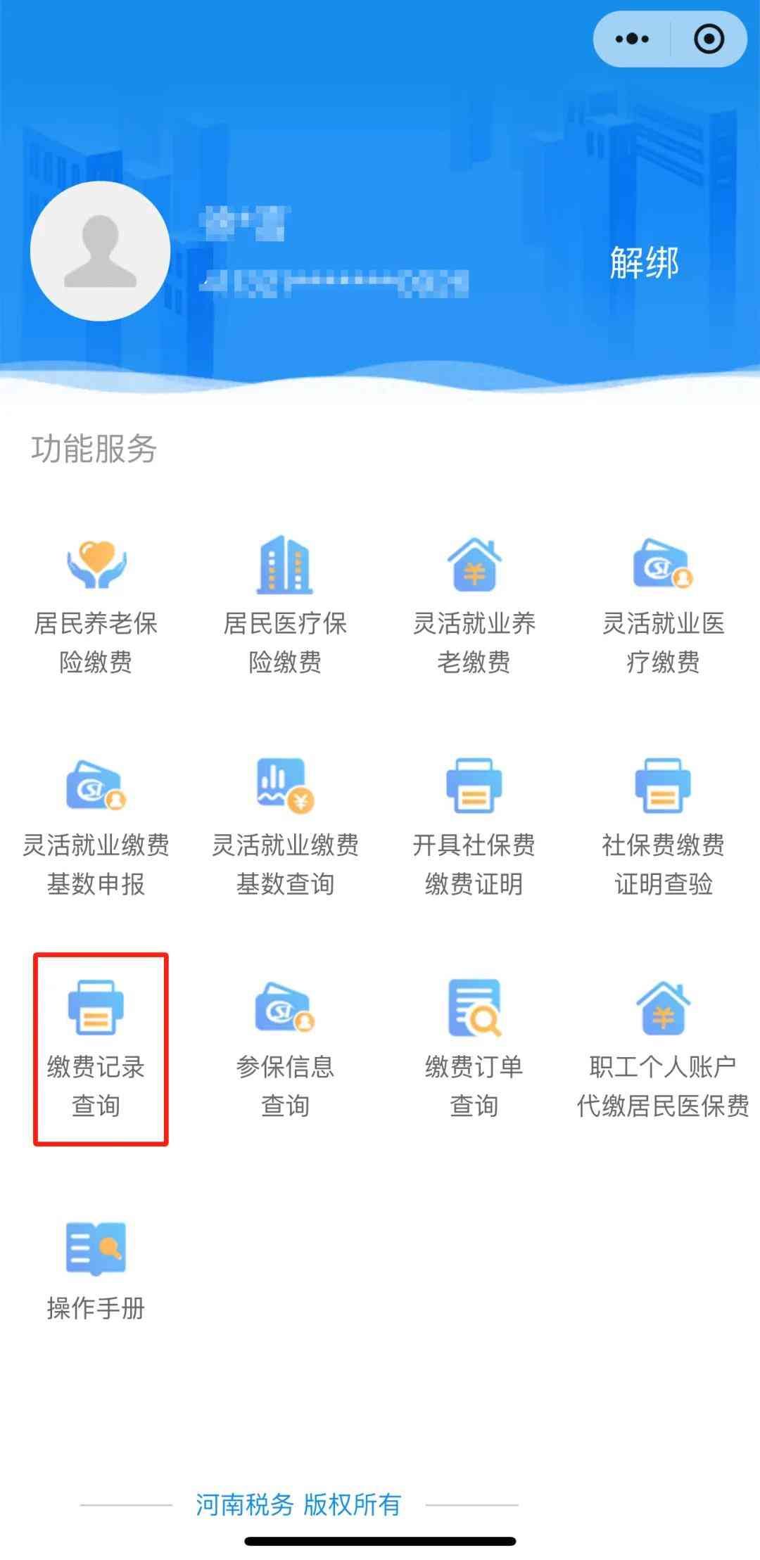 关注“河南税务”微信公众号,选择【微服务】—【社保费缴纳】,即进入“河南税务”微信小程序。