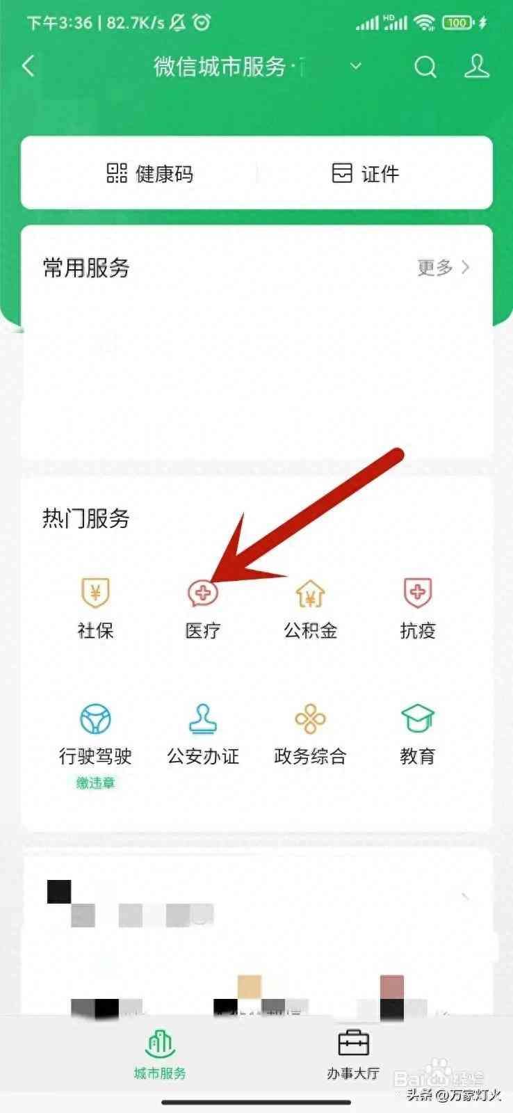 好,接下来在“服务”页面中,滑动屏幕,寻找“城市服务”。这一块儿就像是咱们的生活便捷小助手,里面有很多实用的信息和服务哦!进入后,找到“医疗”这项,继续往下走。