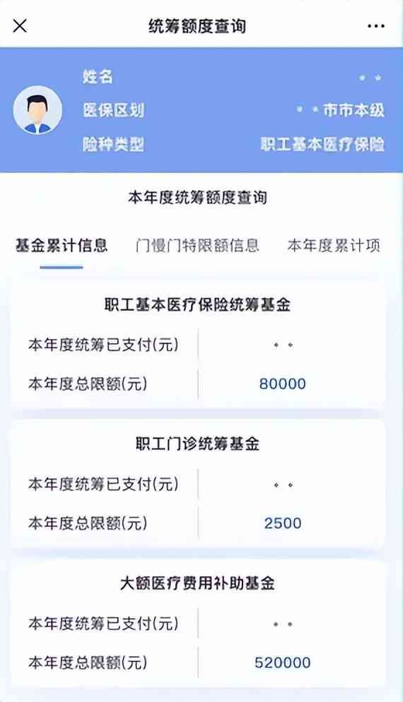 ▲分别点击“基金累计信息”“门慢门特限额信息”和“本年度累计项”标签,可查看相应信息。
