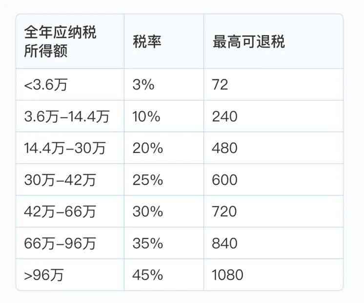 个税税率越高,退税金额越高,具体金额可参考下图: