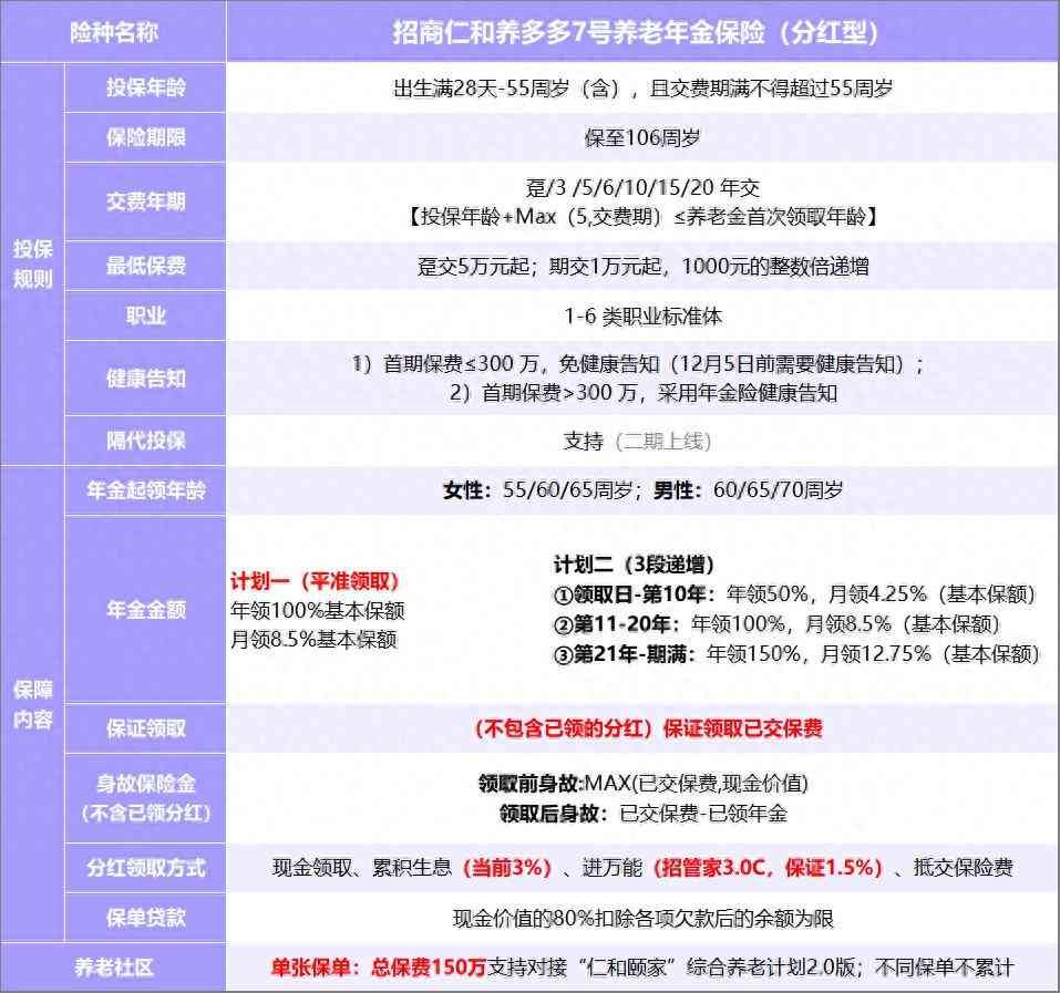 这段时间,新上线的招商仁和养多多7号养老年金险(分红型)养老利益很出众,很多朋友表示想买。