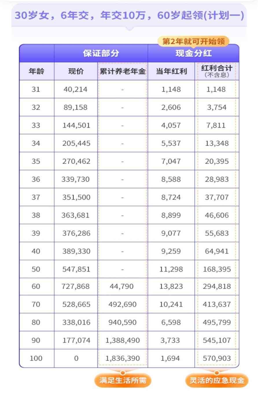 举个例子:30岁女性投保计划一,年交10万交6年,60岁起领