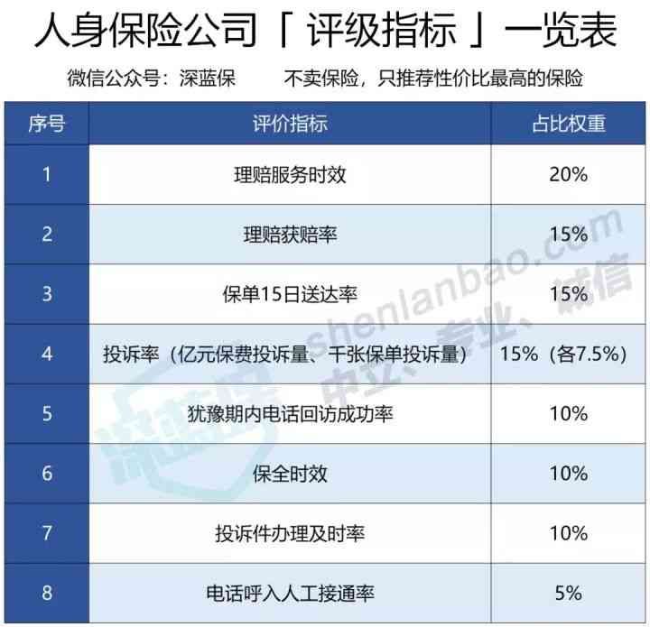 理赔服务最重要:前两项都和理赔相关,分数占比是最高的,合计达到 35%,这当然也是大家最关心的服务。投诉率也很重要:投诉率的高低,也能侧面反应用户在服务上体验的好坏,相关占比也达到了 25 %。除此之外,保单送达时效、业务办理的速度、电话接通率等,也会影响服务体验,因此都纳入到评级。