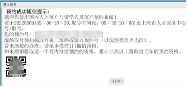 5.预约成功,系统返回确认界面,用户可选择打印该确认信息,包括预约二维码(含有预约号)