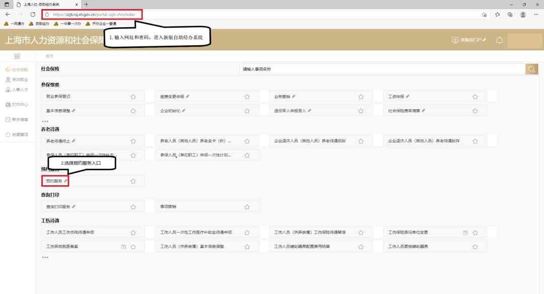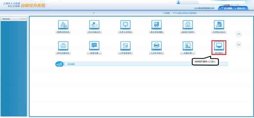 步骤一:输入网址,使用电子营业执照或法人一证通登录后选择“社会保险——预约服务”目录下的“预约服务”入口进入预约界面。