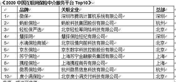 胡润研究院今日发布《2020中国互联网保险中介服务平台Top10》,列出了中国10强互联网保险中介服务平台,按照近两年互联网平台在保险中介领域的市场实力和创新能力进行综合排名。榜单显示,腾讯旗下保险代理平台微保位列榜首,蚂蚁集团旗下蚂蚁保险位列第二,轻松筹公司旗下轻松保严选位居第三。