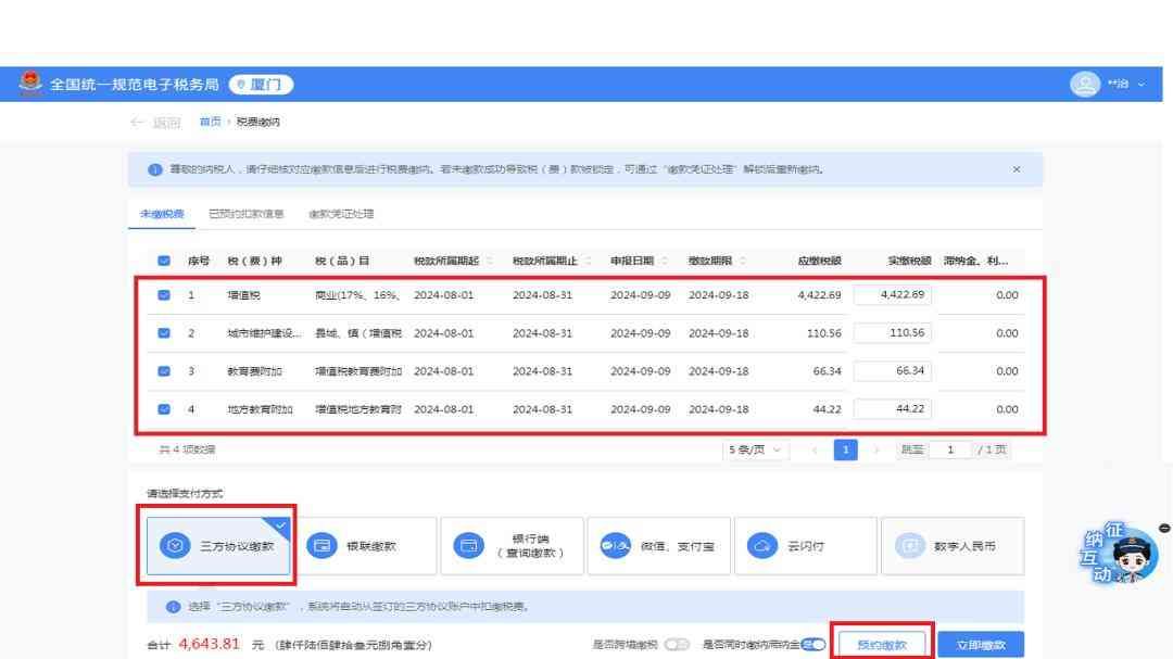 答:电子税务局增加了类似于信用卡自动还款的预约缴款功能,如果您已经签订了三方协议,在您完成申报后,可以预先设置期望缴纳税费的时间,电子税务局将于预约日零点整进行自动扣款,建议纳税人确保预约日零点前三方协议所关联的银行账户中存在足额资金,以实现自动扣缴。
