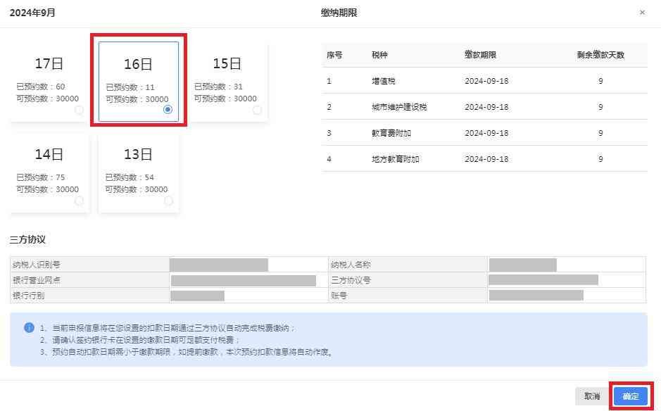 根据您的需求选择预约缴款日期,点击【确定】后即可预约成功。