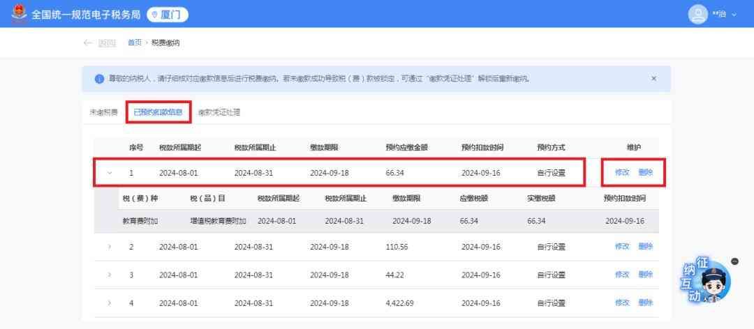答:可以。纳税人可在首页右上角搜索栏输入“税费缴纳”,点击后便可重新看到“已预约缴款信息”。如果您需要更正预约时间,只需点击“维护”栏次的“修改”选项。此时,界面将重新显示可预约时间及三方协议等明细信息,纳税人可进行选择。
