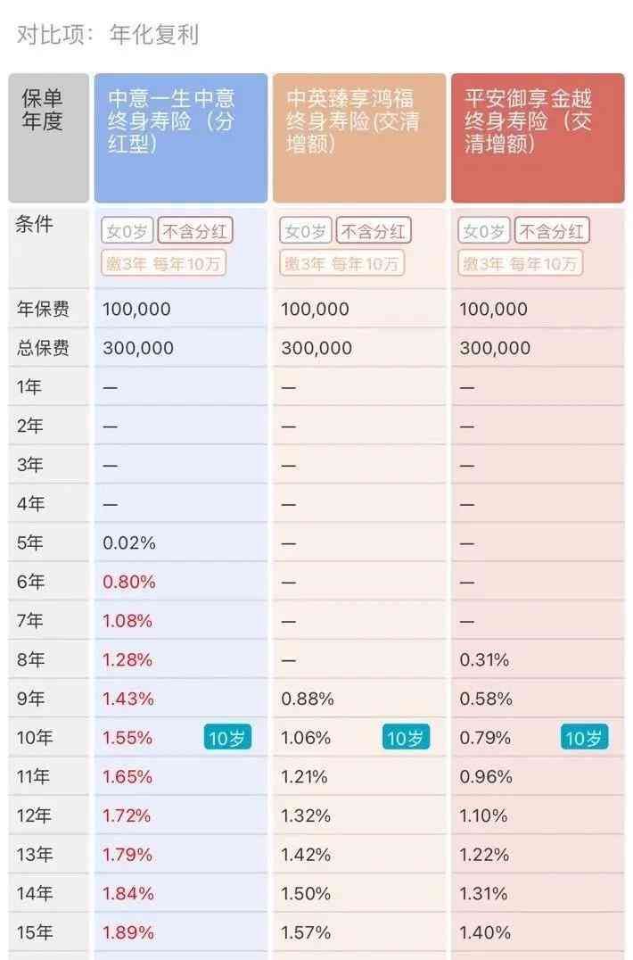 同样保单,持有10年,中意一生中意的内部回报率IRR为1.55%,中英臻享鸿福为1.06%,平安的御享金越只有0.79%。