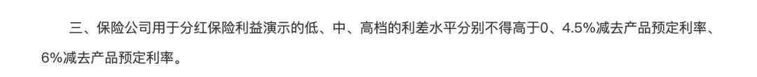第3条:保险公司用于分红保险利益演示的低、中、高档的利差水平分别不得高于0、4.5%减去产品预定利率、6%减去产品预定利率。