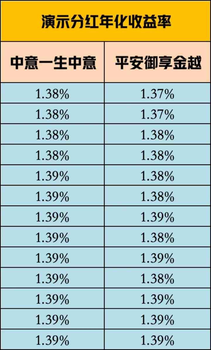 所以我们看现在分红险产品,无论是一生中意还是平安御享金越,它的分红演示年化复利收益率大多都在1.4%左右。