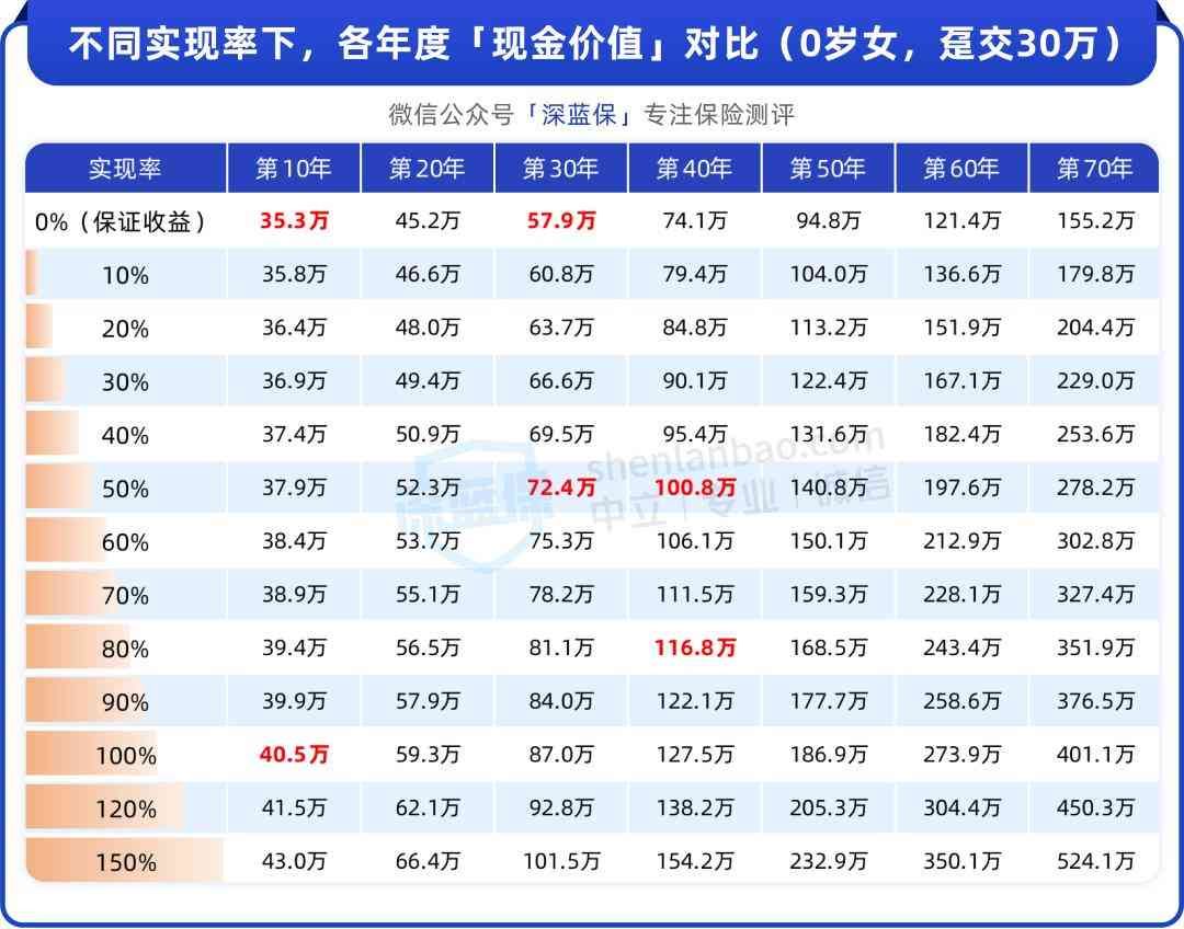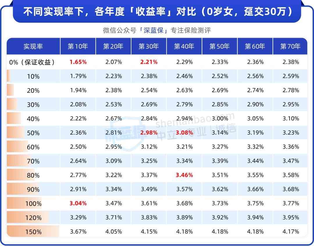 如果达到1%,也就是演示收益,第10年收益率就有3.04%,趸交30万,第10年就能拿到40.5万。
