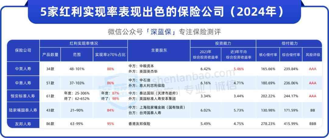 大都是合资型险企,中方基本是国企,另一方则是历史悠久、经验成熟的世界知名保险公司,所以经营比较稳健;偿付能力表现好,偿付率都很充足,而且有3家风险综合评级达到AAA级,这是最高等级,今年第二季度,70多家寿险公司里只有5家达到这个等级;投资能力强,多家公司投资收益率都在5%左右,去年保险行业平均综合投资收益率只3.22%,上表中有4家公司仍然取得了6%左右的收益率。所以如果想买分红险,从这些保险公司里面选择,未来的分红会更有保障。