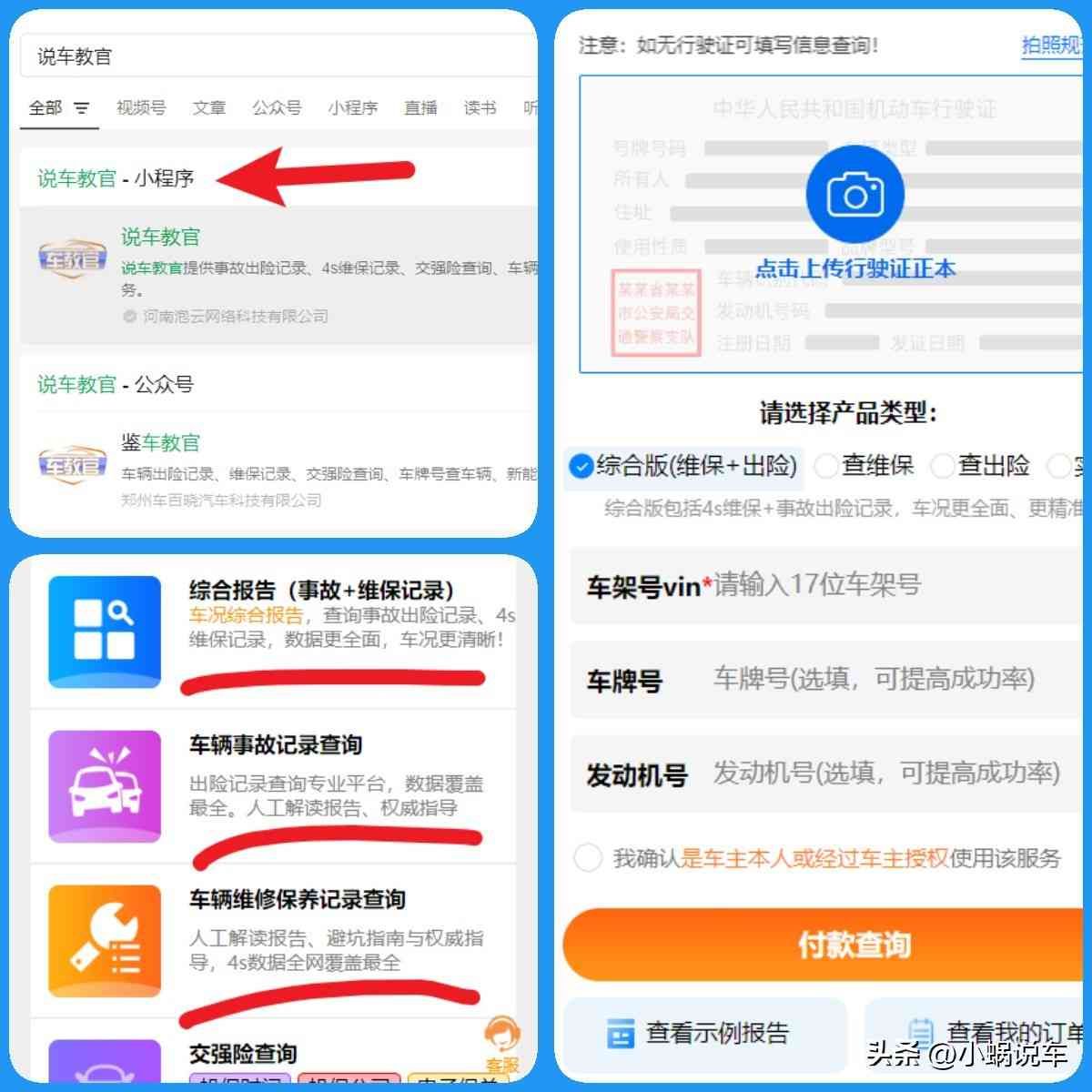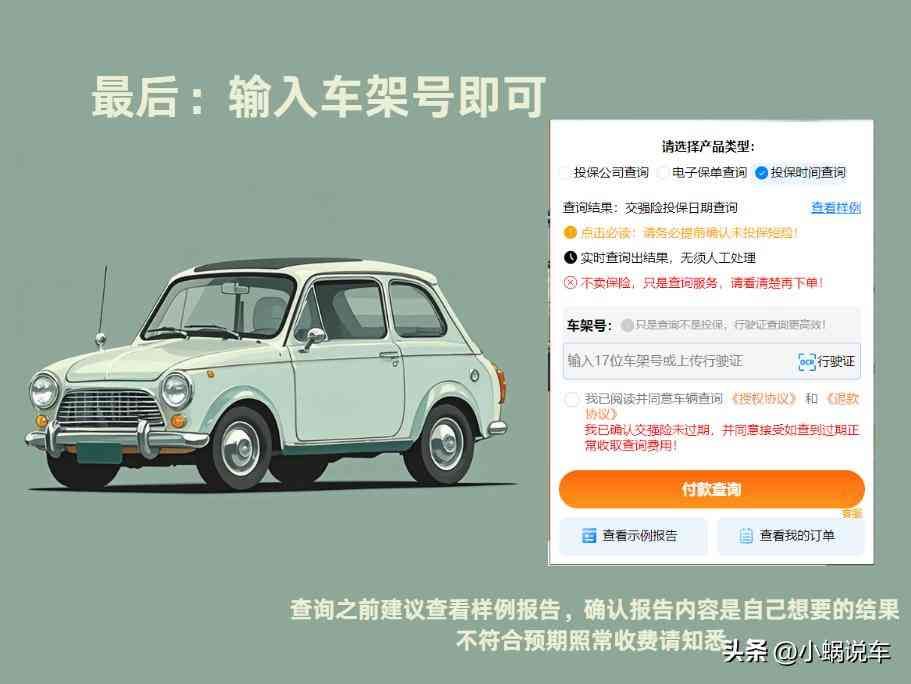 掏出人人都有的手机,打开微信搜索【说车教官】小程序;进入小程序,找到【交强险查询】;点击进入,选择【电子保单】或者【投保公司】查询;最后输入17位车架号或者上传行驶证,点击付款查询即可。(查询之前建议查看样例报告,确认报告内容是自己想要的结果,不符合预期照常收费请知悉 )