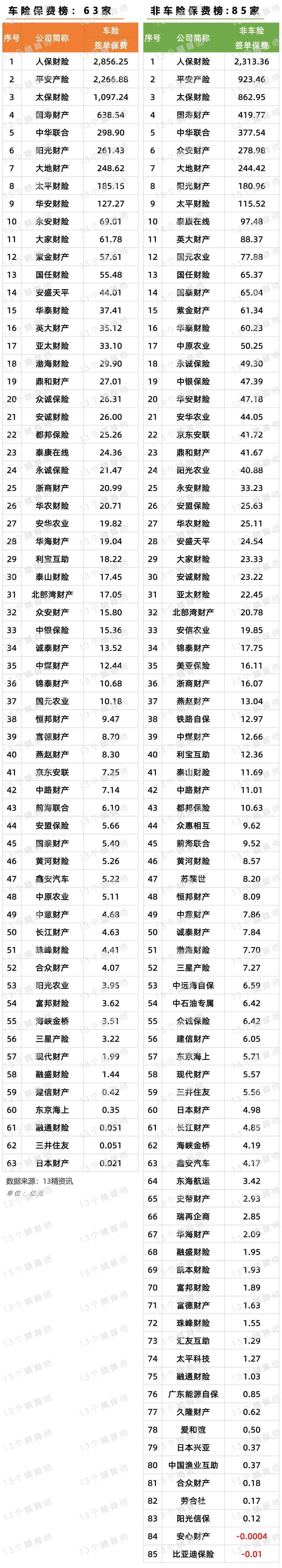 85家非车险保费排名榜