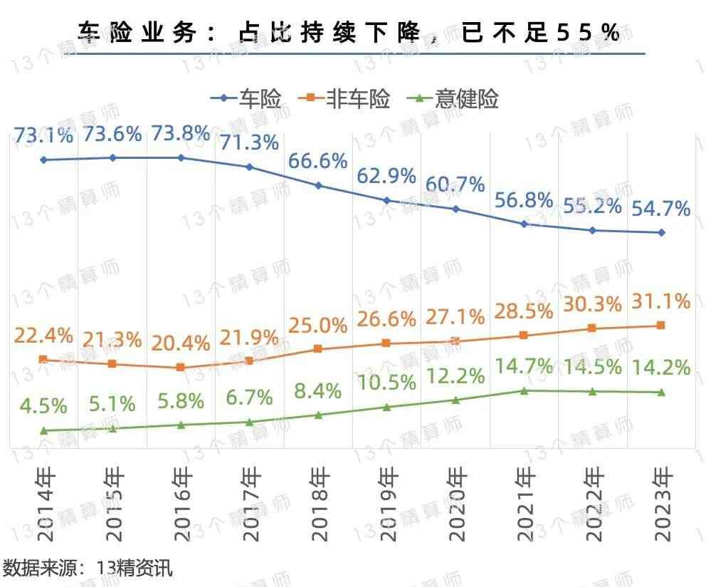 根据监管披露的数据,车险业务占比已经从2014年的73%,降至2023年的54.7%,下降超18个百分点。