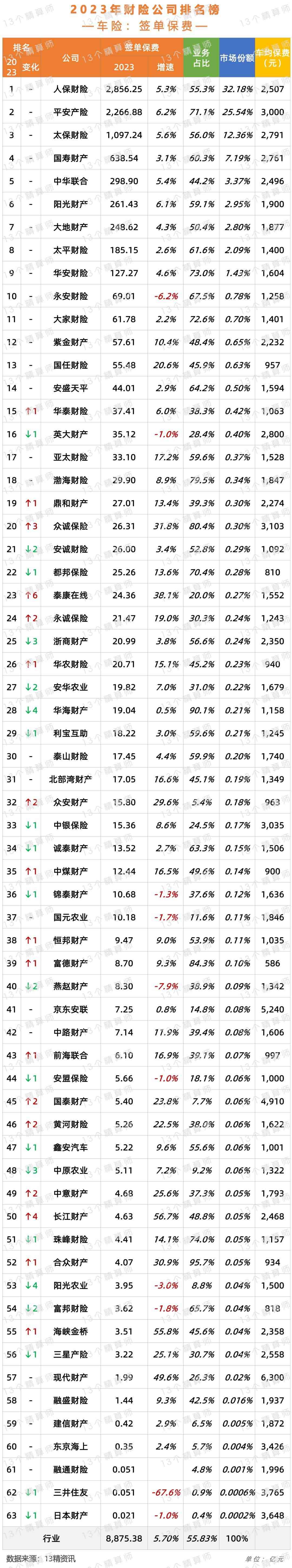 《2 023年财险公司保费排名榜》