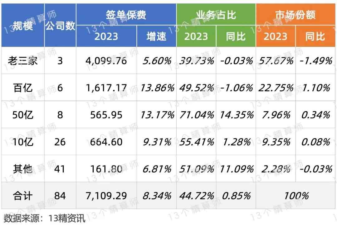 分规模去看,按照2023年末车险保费规模,将63家险企划分为五类,百亿和30亿险企的市场份额明显下降。