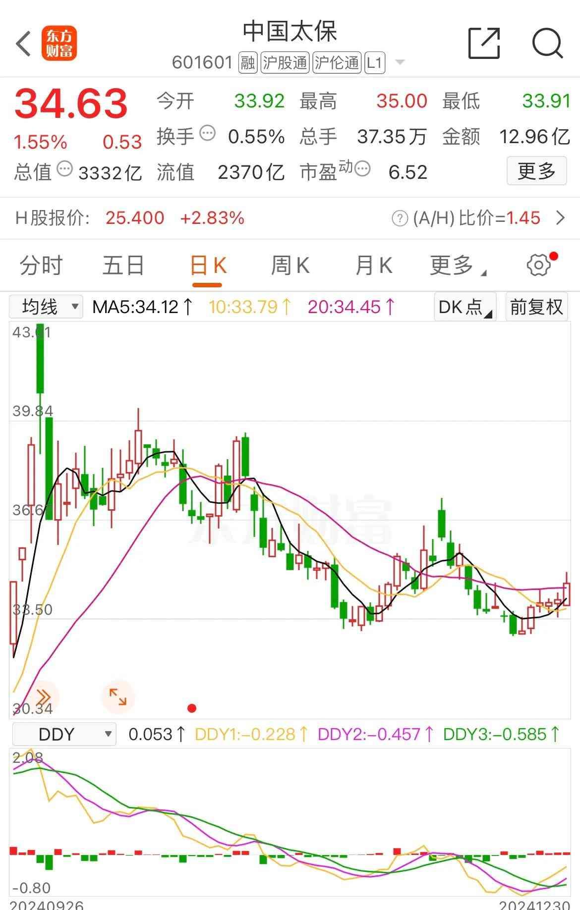 (5.)中国太保(601601),流通市值:2370亿元,2024年以来涨幅:52.15 %。