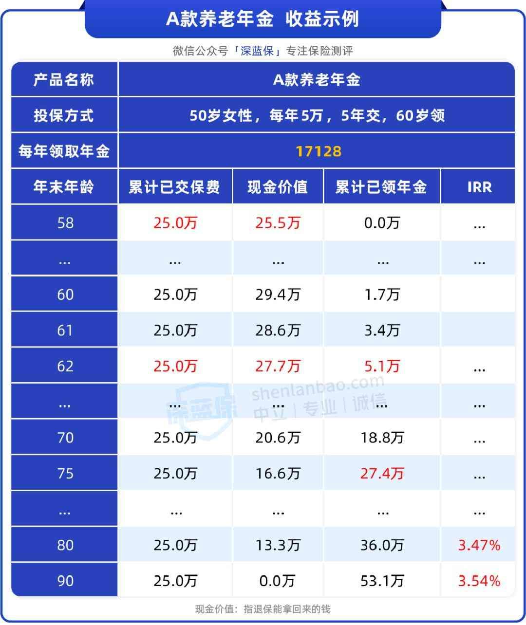 55岁交完保费,58岁现金价值就超过已交保费,后面每年领的钱,都算是赚的。