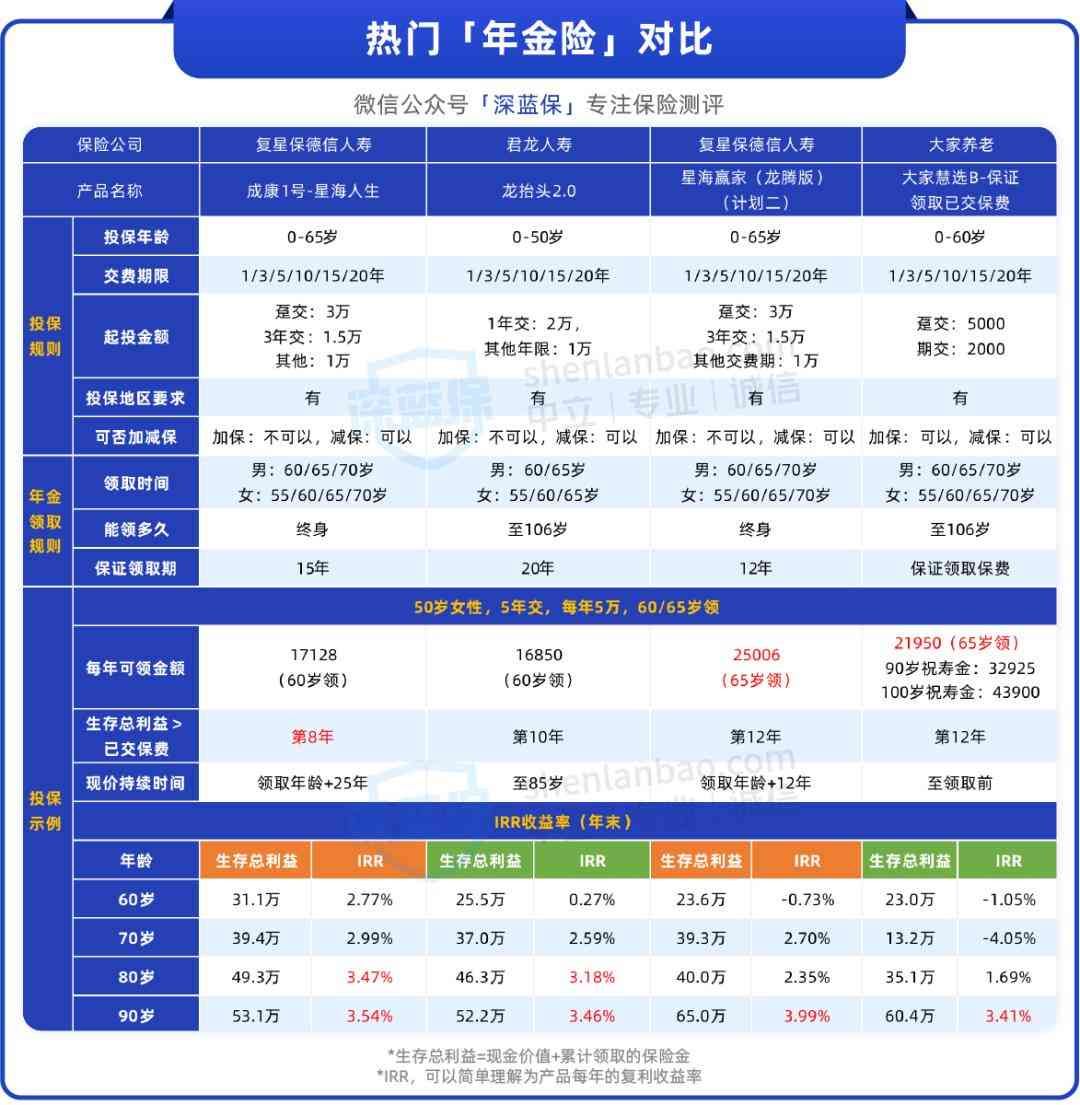 还要提醒一下,50岁左右买养老年金,缴费期不建议拉太长,3-5年内交完最好。