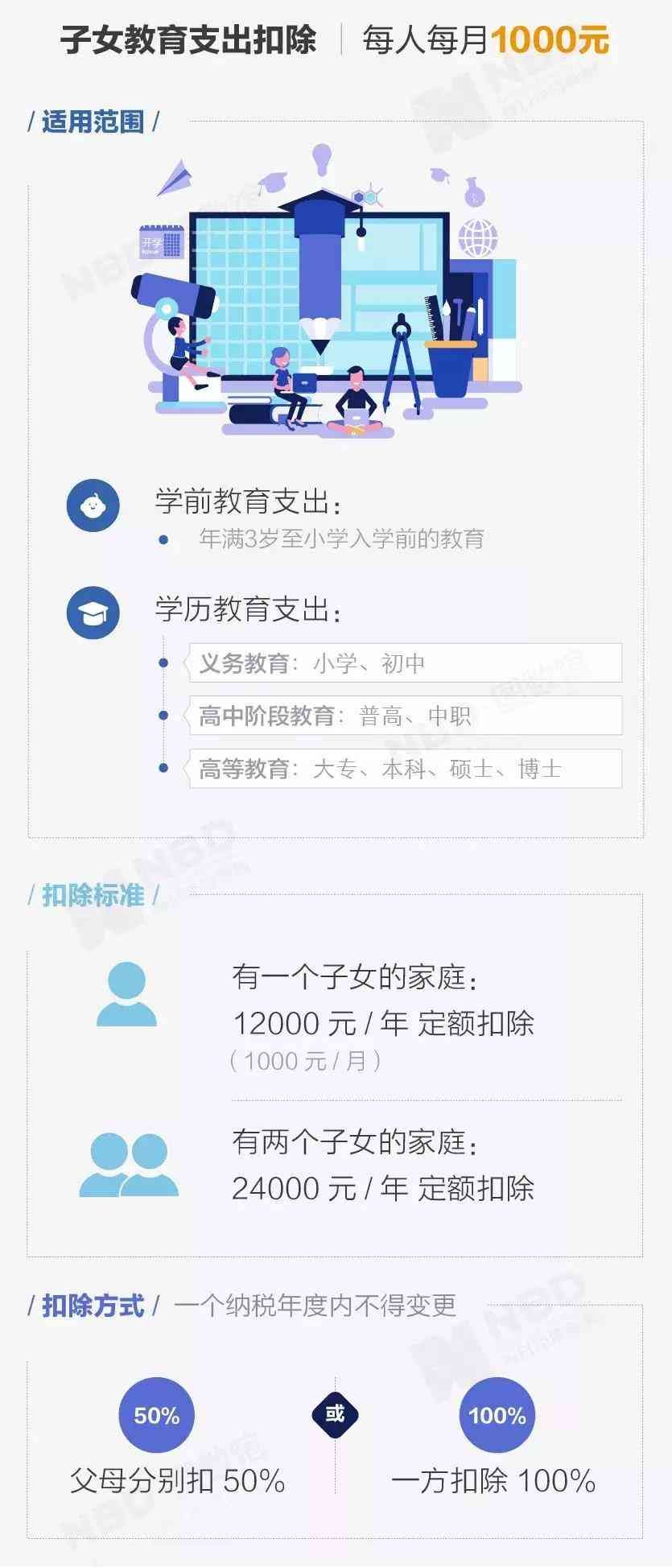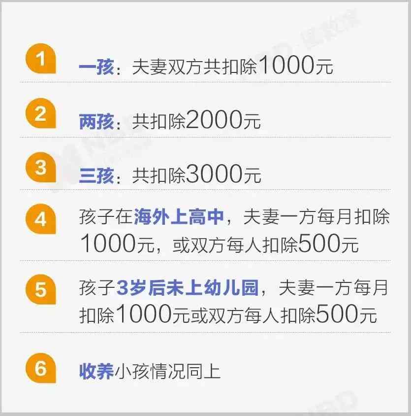 子女从满3周岁至教育结束,不论处在什么教育阶段,不论是在中国境内还是境外接受教育,均可按照每个子女/月扣除1元,或由夫妻双方每人各扣除5元计算。