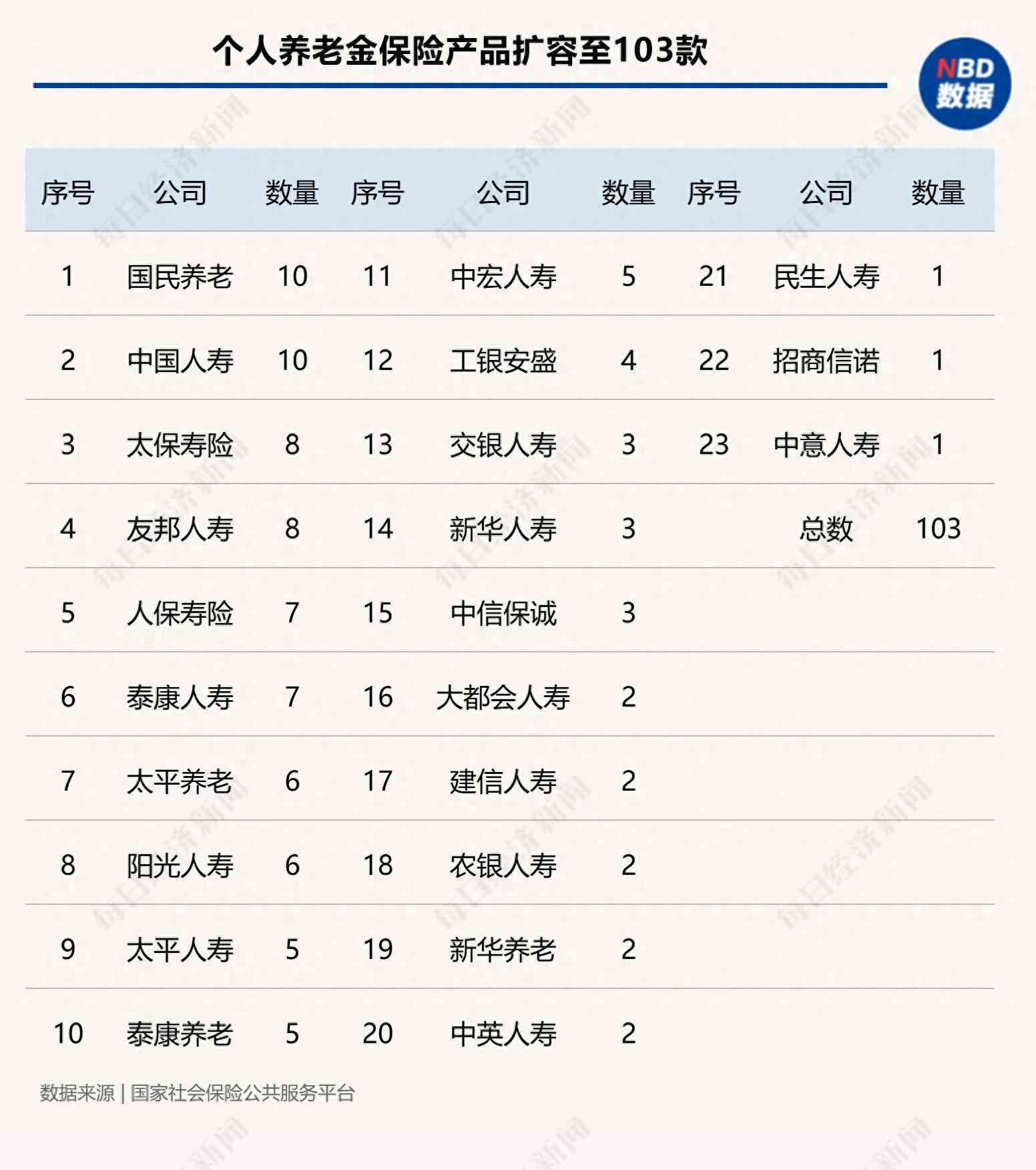 具体而言,国民养老、中国人寿各有10款,太保寿险、友邦人寿各有8款,人保寿险、泰康人寿各有7款,太平养老、阳光人寿各有6款,太平人寿、泰康养老、中宏人寿各有5款,工银安盛有4款,交银人寿、新华保险、中信保诚各有3款,大都会人寿、建信人寿、农银人寿、新华养老、中英人寿各有2款,民生人寿、招商信诺、中意人寿各有1款。