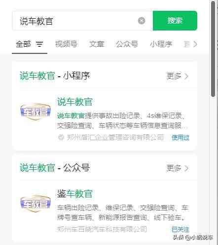 微信查询车辆交强险电子保单方法教程如下,首页打开,随便搜一下【说车教官】这个小程序,打开后找到并选择交强险查询,也可以直接点击分类如:投保时间查询、投保公司查询,电子保单查询。选好之后根据提示输入车架号或者上传行驶证照片即可。