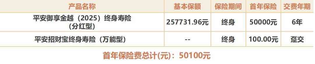 以上海的陈女士为例。刚满30岁的她,在平安御享金越(2025)终身寿险(分红型)保险产品计划上市伊始,就主动联系了她的保险代理人重点了解这个产品。她表示,一是她关注到政策的变化,二则是考虑到,自身所处的行业近年大环境不确定性加剧,她希望在当下自己的能力范围内,锁定一定时间长期投入,“进退有度”,提前为自己配置一份安全的保障。经过考虑,她为自己投保了平安御享金越(2025)终身寿险(分红型)保险产品计划,首年保费为5元,交费期6年,招财宝趸交1元。