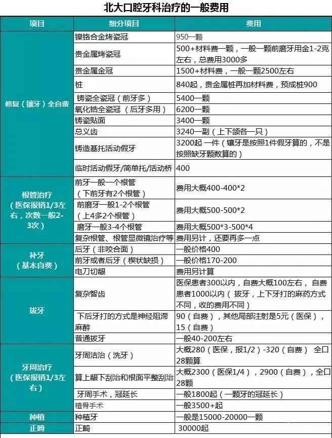 以下为网传的北大口腔医院的一般费用表,仅供参考: