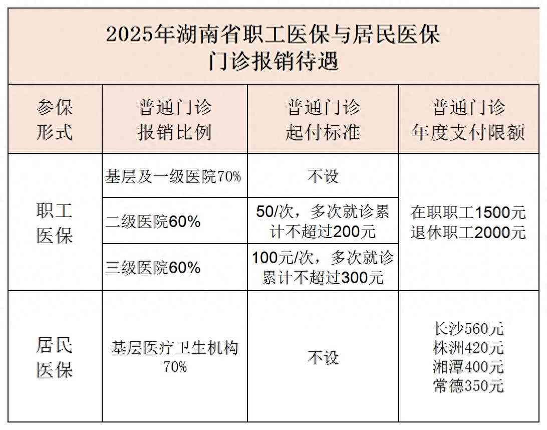 每个地区的规定都不一样,以当地为准即可,小编这里以湖南长沙为例(下图是湖南2025年医保普通门诊报销待遇),长沙的居民医保门诊统筹报销额度是560元/年(只能在基层医院使用:比如社区医院、乡镇卫生所、大学的校医院,基层医院无起付线要求),职工医保(定点的药店和医院都可以使用),在职职工的门诊统筹报销额度是15元/年,退休人员的门诊统筹报销额度是2元/年。