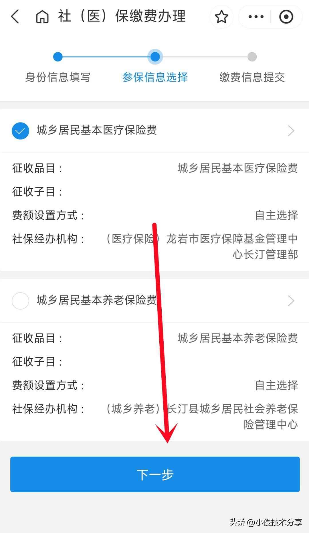 点击下一步之后,就会出现【参保信息选择】页面,在这边我们可以看到有2个种类,分别是【城乡居民基本医疗保险费】和【城乡居民基本养老保险费】,也就是我们所说的【医保】和【社保】,我们选择自己要缴费的项目,比如说【医保】,我们就选择【城乡居民基本医疗保险费】进行勾选,勾选完成之后,点击下一步