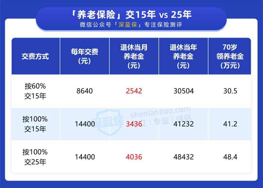 按 60% 档次交 15 年养老保险,退休后领的养老金最少;而按 1% 档次交 25 年,会比同样档次只交 15 年每年多领 72 块,10 年下来就是 7 万多,这还不算每年的社平工资涨幅。