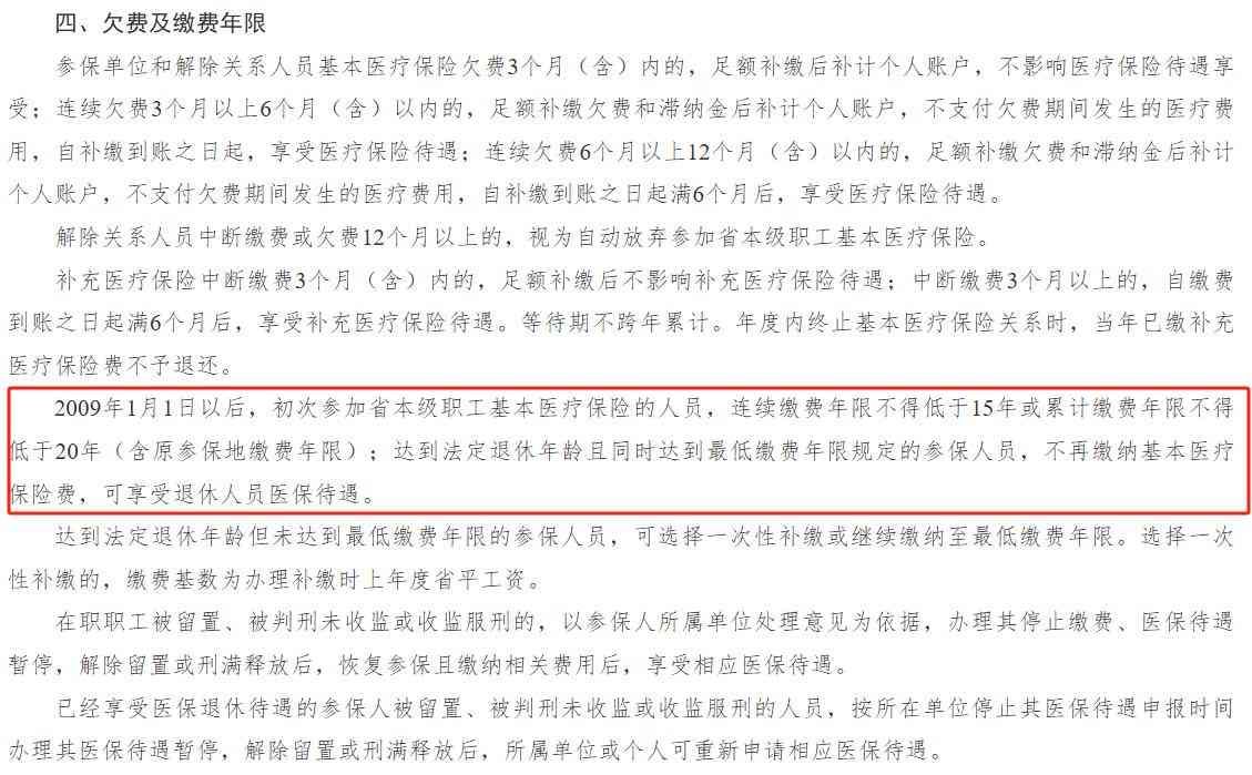 以上两点我们只需要满足一点就可以享受终身的医疗待遇。连续缴费年限指的就是我们在四川省连续缴纳医保,中间没有出现过断缴情况,这样的话,只要满足15年的要求,在达到法定退休年龄之后就可以不用再缴纳医保,也可以终身享受医疗待遇。而累计缴费年限与养老保险的缴费年限要求差不多,中间允许断缴的情况发生,但是中间出现过断缴情况或者我们在异地未在四川省当地缴纳的话,就需要缴纳20年后,在达到法定退休年龄之后可以享受终身医疗待遇。当然,这里的累计缴费年限包括视同缴费年限以及实际缴费年限。