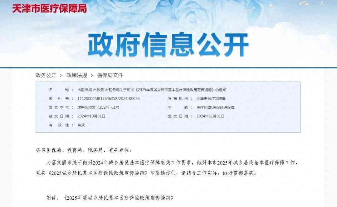 11月1日,天津市医疗保障局网站发布了市医保局、市教委、市税务局联合印发《2025年度城乡居民基本医疗保险政策宣传提纲》的通知,详细介绍了参保范围、缴费标准和方式、待遇标准、报销手续等具体政策。