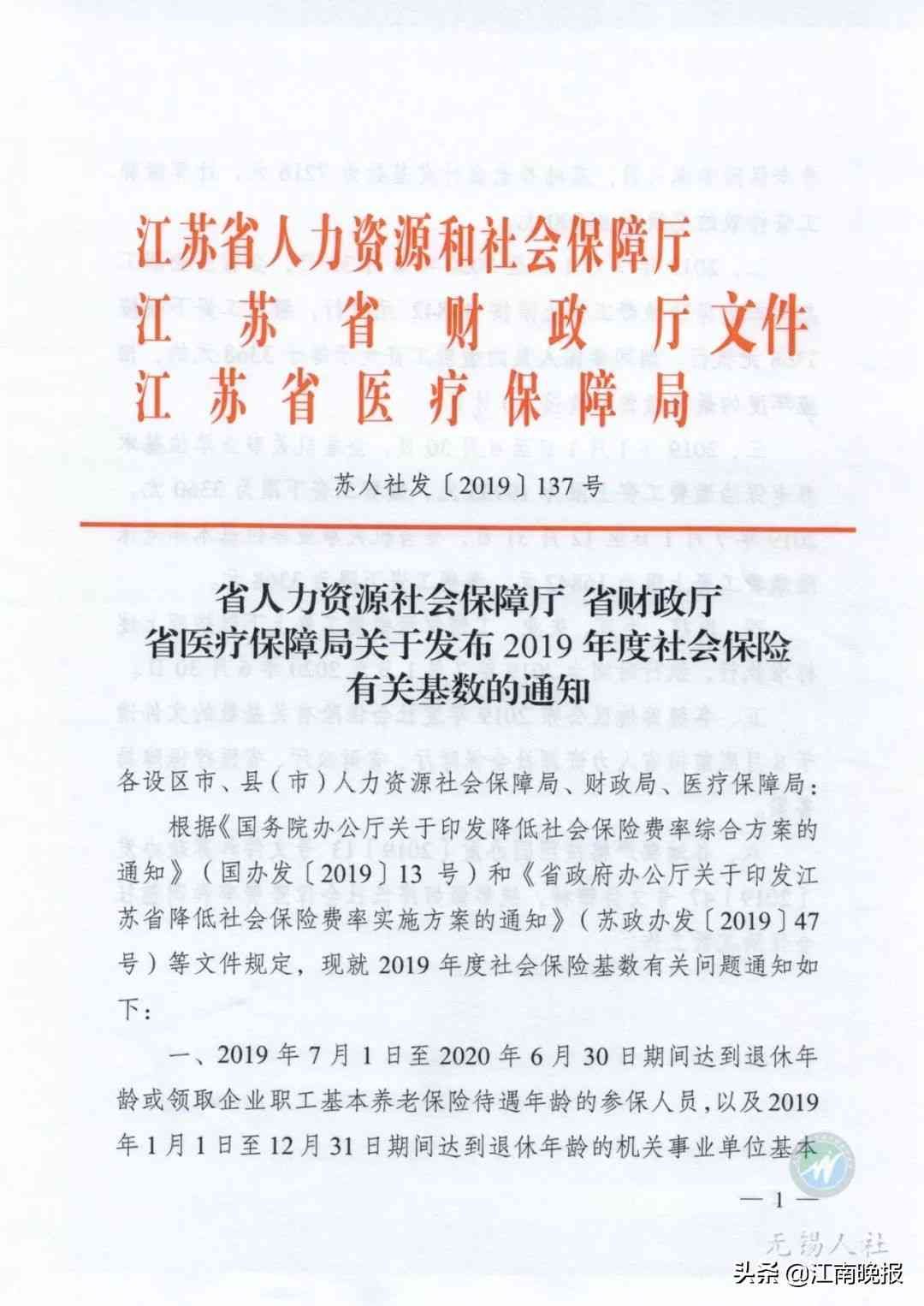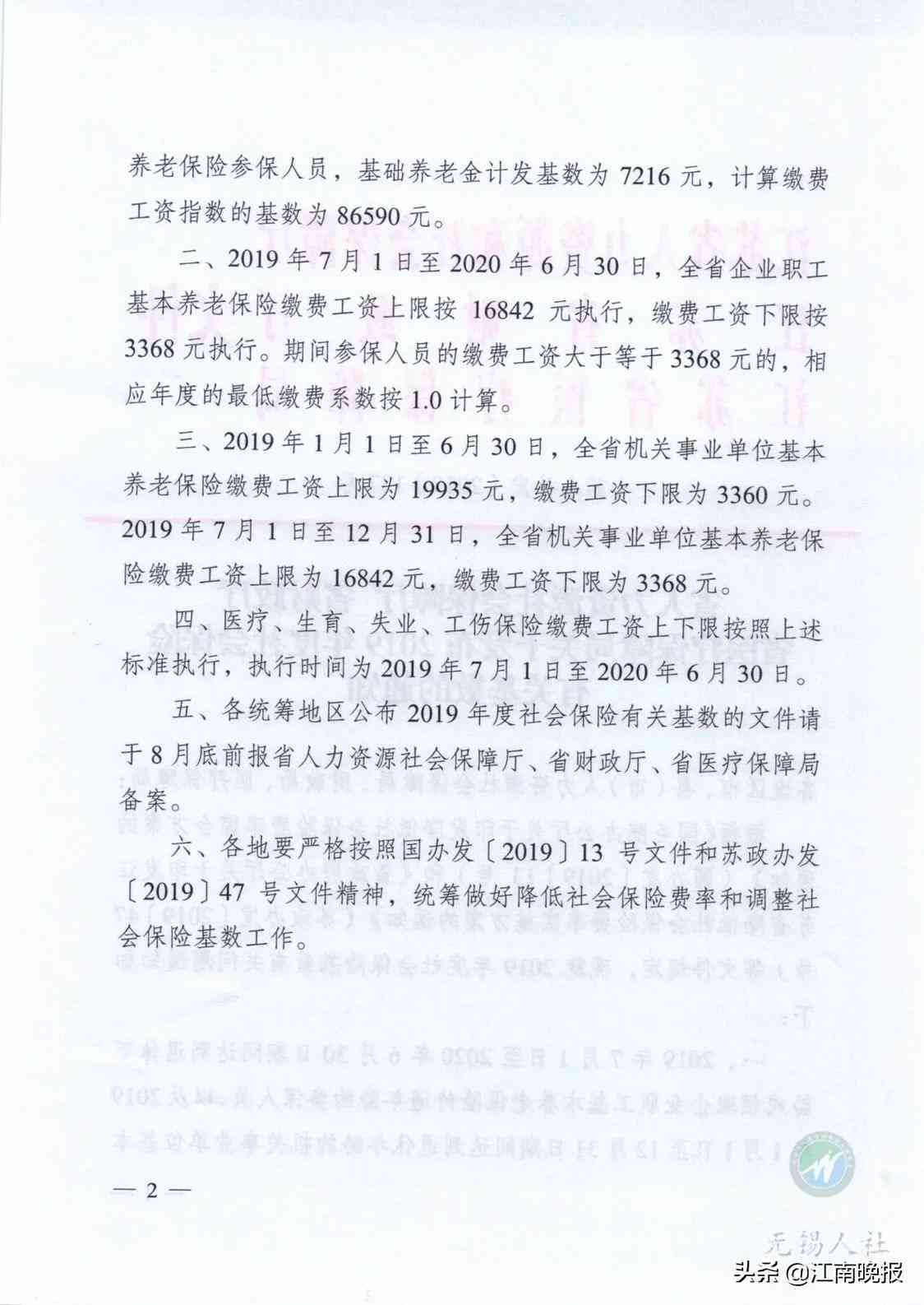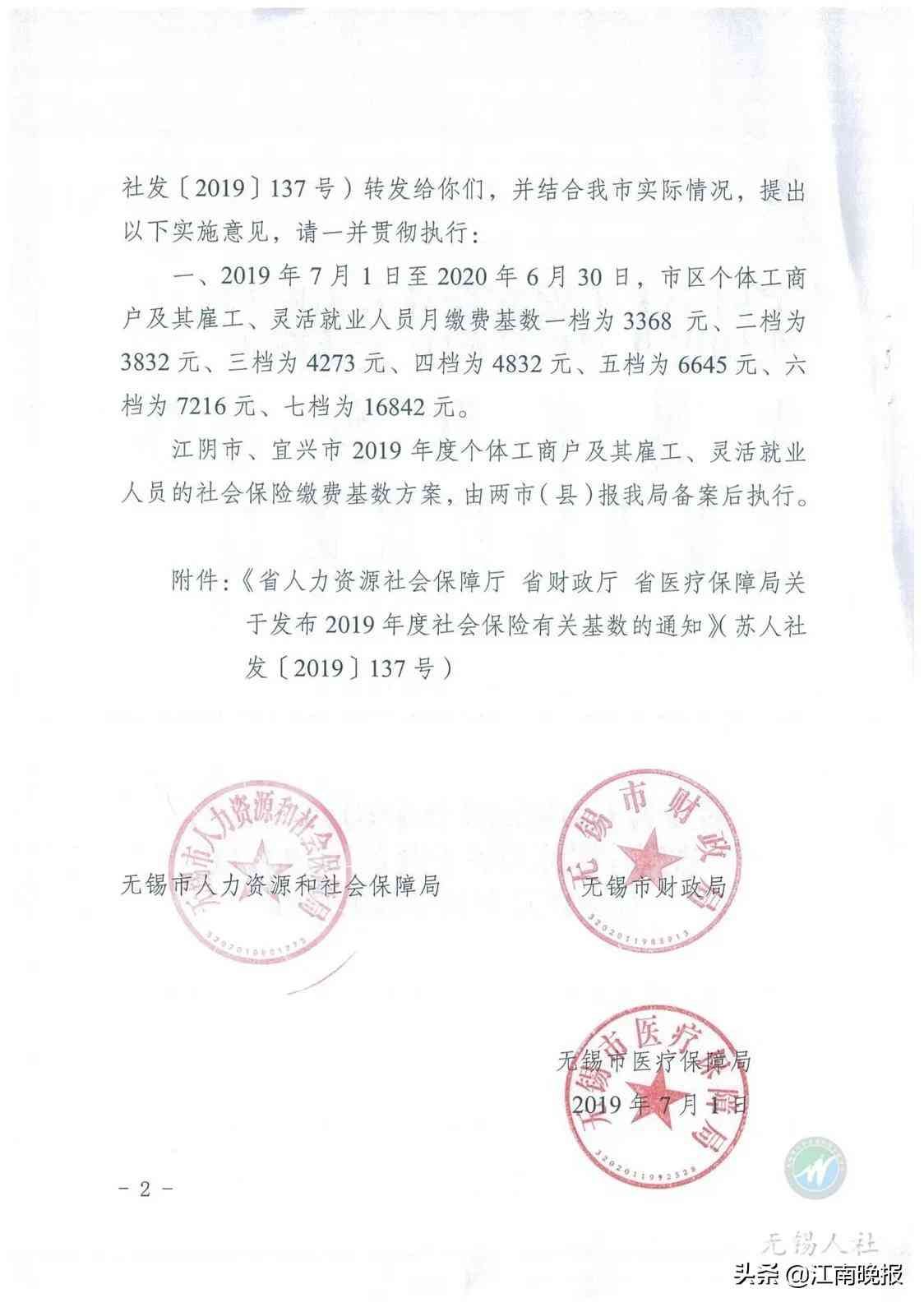 日前,省人社厅、省财政厅、省医疗保障局联合出台《关于发布2019年度社会保险有关基数的通知》(苏人社发﹝2019﹞137号),明确自2019年7月1日起,我省缴费基数上限按照16842元执行,下限按照3368元执行。