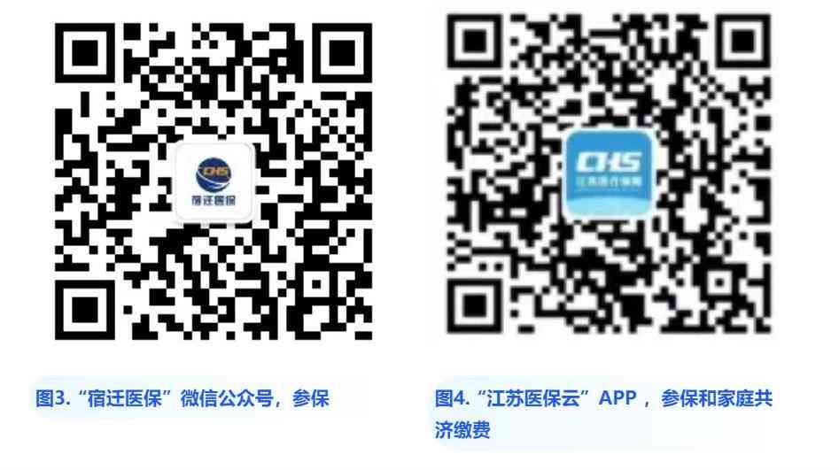 3、手机银行:建设银行、民丰银行、交通银行。4、POS机缴费:乡镇(街道)社保专用POS机,民丰银行、泗阳农商行金融服务站POS机。5、家庭共济缴费:“江苏医保云”APP,省内职工医保参保人员可使用医保个人账户余额为近亲属缴费,包括配偶、父母、子女、兄弟姐妹、祖父母、外祖父母、孙子女、外孙子女。6、其他缴费方式:另行通知。(注:初次参保人员,请关注“宿迁医保”微信公众号(图3)或下载“江苏医保云”APP(图4)线上办理参保登记,或携带户口簿到户籍所在地的乡镇(街道)民生事务局或便民服务中心线下办理参保登记)