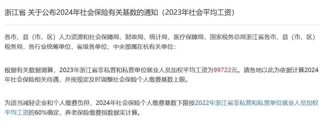 在确定了2024年浙江省社保缴纳基数后,我们即可确定2024年浙江省社保缴纳的上下限基数。