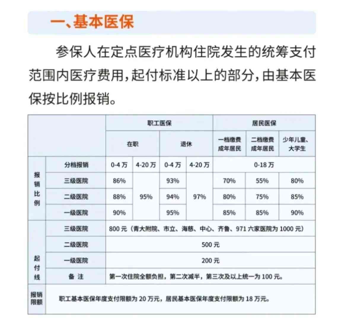 看起来居民医保的报销比例不算太低,三个级别医院的报销比例一般在55%~85%之间,而职工医保一般在85%以上,退休职工医保报销比例是93%~97%。可是真到用的时候,就看出来了。报销范围内的待遇,一种需要个人负担15%~45%,而另一种只需要个人负担3%~7%。