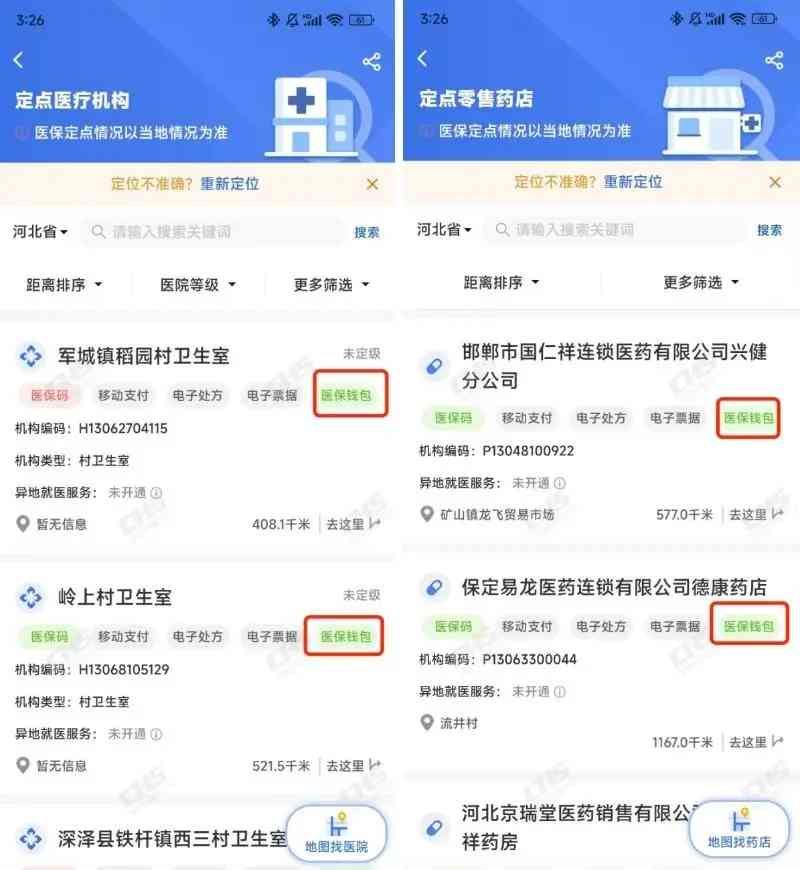 通过国家医保服务平台App查询服务,“定点医疗机构”和“定点零售药店”,可查询当前已开通医保钱包支付的定点医药机构。