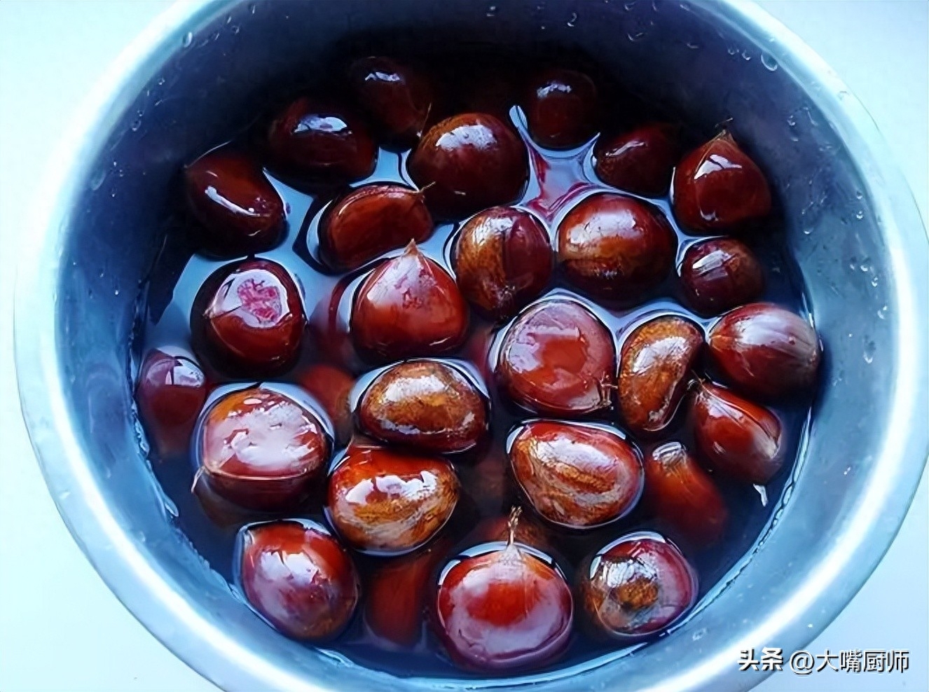 7、用这个方法剥板栗壳,是连着内膜一起剥下来的,不会粘连在板栗上。之所以要用清水浸泡着,就是为了防止板栗变干,这样板栗壳会变硬,而且内膜也会重新粘在板栗上。