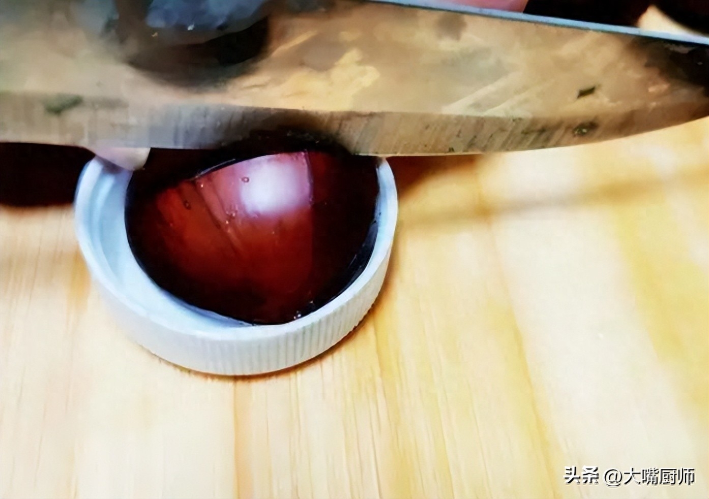 3、准备一个塑料瓶盖,建议用脉动的瓶盖,比较大,如果是矿泉水瓶盖,板栗太大的话就放不下了。把瓶盖放在案板上,放入一个板栗,用刀轻轻在外壳上划出一个口子。