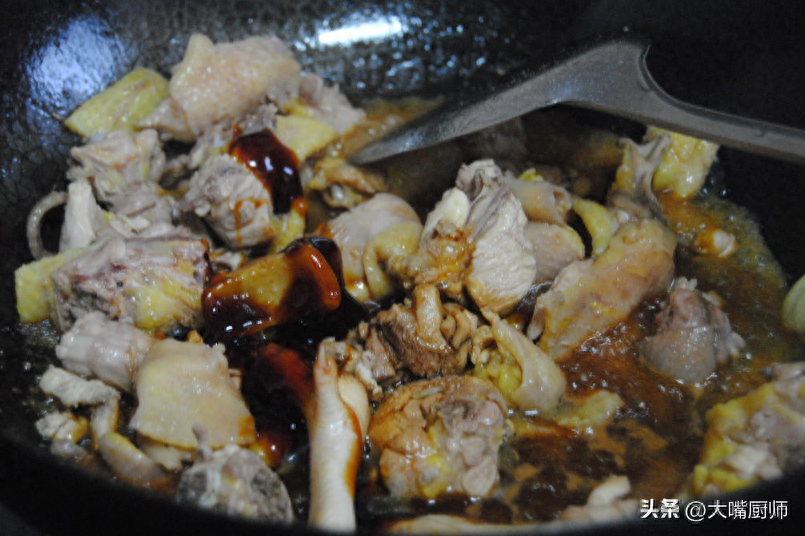 第二步、起锅,鸡块冷水下锅,加入葱段、姜片、料酒煮3分钟,撇去浮沫,捞出冲洗干净。另起锅,倒油烧热,下入葱姜爆香,倒入鸡块炒成金黄色。