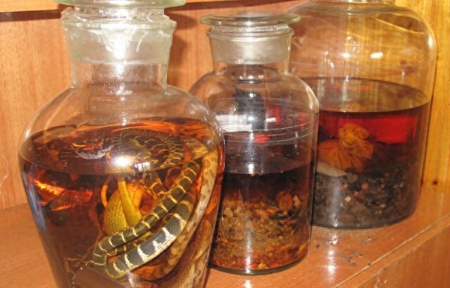 而且,使用的蛇种的毒性越强,药酒的功效就越强。这种酿酒方式至今仍在不同地区使用。以前在农村,这是一件很常见的事情。我们经常可以看到,尤其是老年人,他们更喜欢酿造这些药酒,他们在透明的玻璃瓶里装满深棕色的酒。这些酒会浸泡各种抗真菌的药物,还有蛇、蝎子。这种毒。