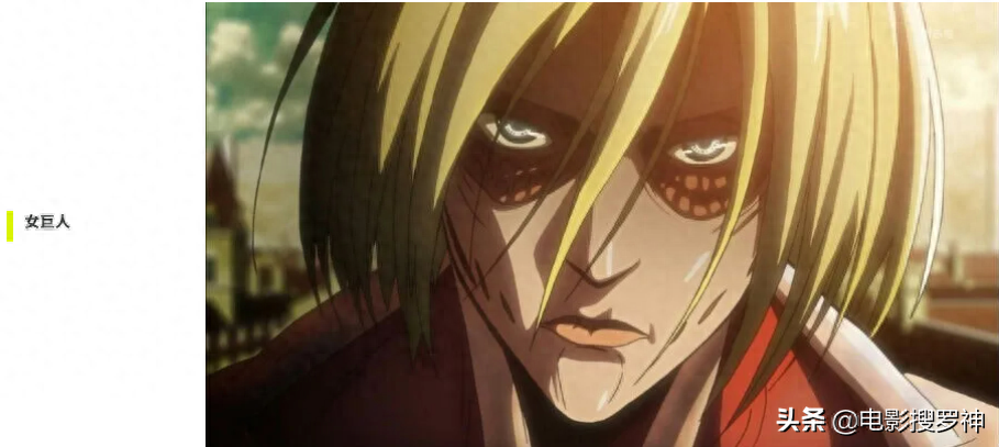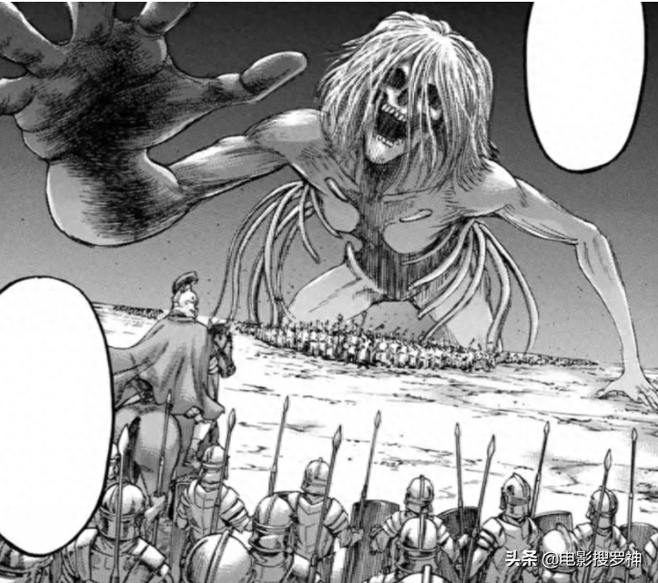 「女巨人」(女型の巨人):身高为14 公尺。与其他巨人相比多了女性的乳房。具有高机动力以及持续力,能够短暂硬质化局部部位,硬度极高拥有特殊能力「吼叫」,能够吸引巨人啃食自己。