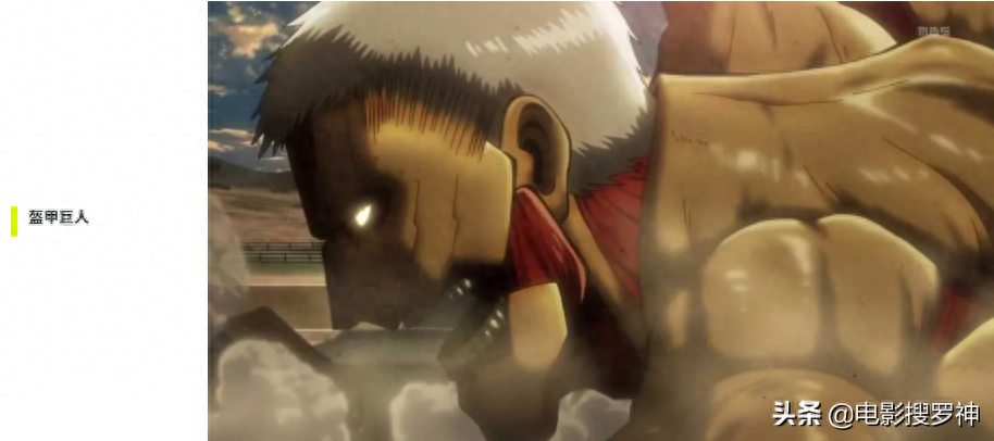 「盔甲巨人」(铠の巨人):身高为15 公尺。全身多处覆盖了硬质化的组织,如同穿了盔甲一样。再生能力非常的差,遭到破坏的部位必须花费极长的时间才能修复,能够将精神传输至巨人体内,因此即便破坏后颈也不一定能将其杀死。
