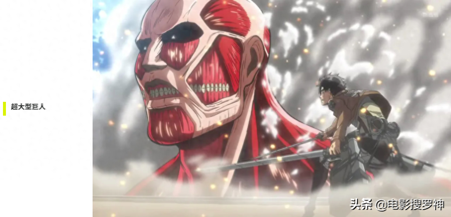 「超大型巨人」(超大型巨人):身高为60 公尺。外表没有皮肤覆盖,因体型巨大所以动作相当迟缓。可以藉由燃烧肌肉组织来排放超高温的蒸气,使得立体机动装置无法发挥作用,并灼伤甚至杀死敌人,也能利用变身时产生的能量引起大范围的爆炸。