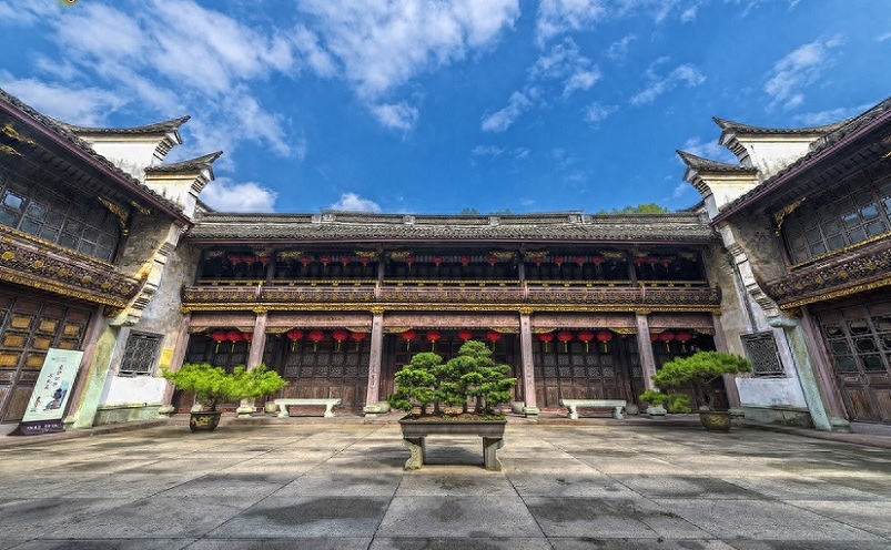 古镇民居为典型的徽派建筑,粉墙黛瓦,卵石铺路,梁枋门窗上大多是精美的木雕装饰品,展示了浙东地区精美绝伦的雕刻工艺;高大的马头墙是江南富户官宅威势的象征,也展示了当地商贾云集的场景。